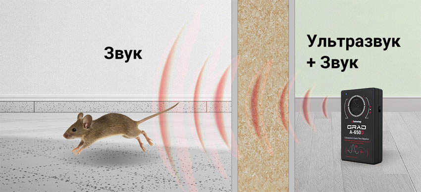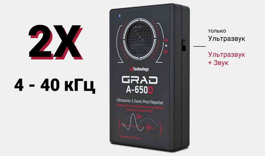 «Град А-650Д» — это уникальная гибридная версия отпугивателей «Град А-500» и «Град А-550УЗ», созданная с учётом рекомендаций владельцев аналогичных устройств, эффективно устраняет любые виды грызунов всего за считанные дни благодаря двум инновационным режимам работы: абсолютно бесшумному (работающему исключительно на ультразвуке, незаметном человеку) и удвоенной мощности (комбинация ультразвука и акустического сигнала).