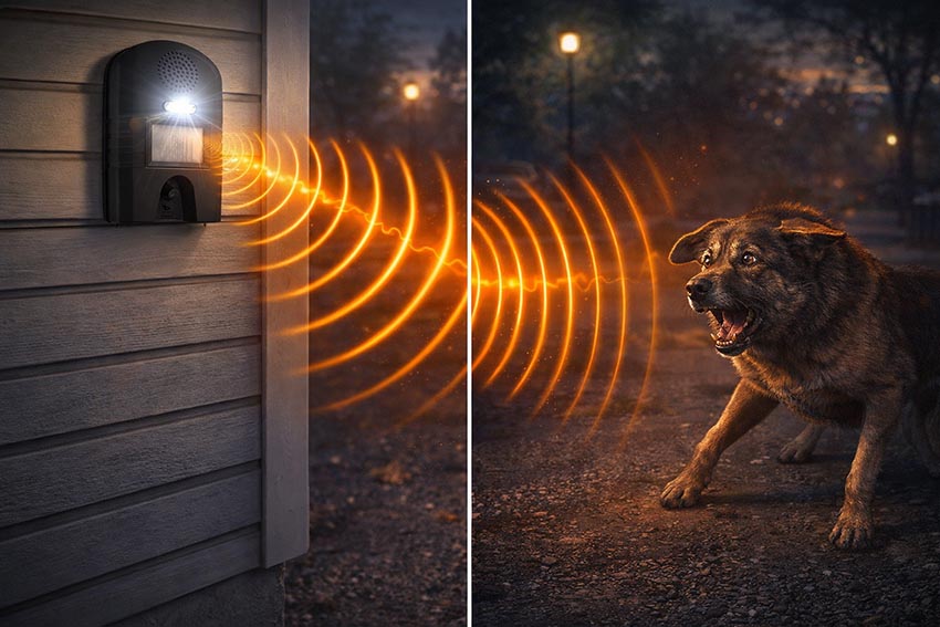 Отпугиватель, установленный рядом с охраняемым участком, сканирует окружающее пространство с помощью датчика движения. Как только в поле зрения последнего появляется движущийся объект (например, бродячая собака), устройство автоматически включает на 7 сек. мощный ультразвуковой сигнал и световые вспышки. Это вызывает у животного панику и заставляет убегать с вашей территории. Если после выключения ультразвука датчик по-прежнему фиксирует наличие движения в охраняемой зоне, отпугивающий сигнал будет повторяться. В конечном итоге "нежеланный гость" покинет вашу территорию.